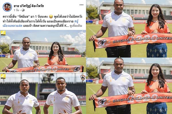 มาดามฮาย ปวิศรัฐฐ ติยะไพรัช ประธานสโมสรทีมไทยลีก 1 สิงห์ เชียงราย ได้โพสต์ภาพคู่กับ รัศมี แข พร้อมแคปชั่นว่า คราวนี้เซ็น รัศมีแข มา 1 วันนะคะ พูดได้เลยว่าไม่ผิดหวัง ทำให้ทั้งทีมมีเสียงหัวเราะได้ทั้งวัน แถมเป็นคนเชียงราย #อู้เมืองแหลวแล่ด เลยเจ้า ติดตามความสนุกนี้ได้ที่ Kwangsong Channel ทาง YouTube นะคะ รัศมี แข ถูกทาง สิงห์ เชียงราย เชิญมาถ่ายรายโดยจะฮาขนาดไหนติดตามได้ที่ Youtube Kwangsong Channel