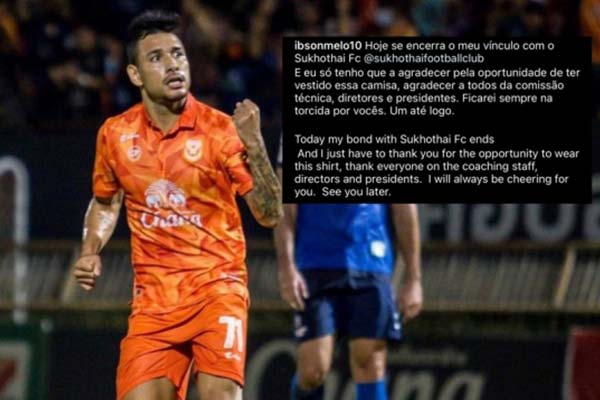 อิ๊บสัน เมโล่ ได้โพสต์อำลาทีมด้วยตัวเองว่า วันนี้เราต้องร่ำลากัน ความผูกพันธ์ของผมกับ สุโขทัย เอฟซี สิ้นสุดลงแล้ว ผมต้องขอขอบคุณสําหรับโอกาสในการสวมใส่เสื้อตัวนี้จริงๆ ขอขอบคุณทีมงานสตาฟฟ์โค้ช และท่านประธานสโมสร ที่ให้โอกาสผมมาโดยตลอด ผมจะเป็นกําลังใจให้เสมอแล้วเจอกัน
