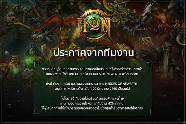 “ทั้งนี้ ทีมงาน HoN ขอเรียนแจ้งให้ทราบว่าเกม Heroes of Newerth จะยุติการให้บริการตั้งแต่วันที่ 20 มิถุนายน 2565 เป็นต้นไป..”